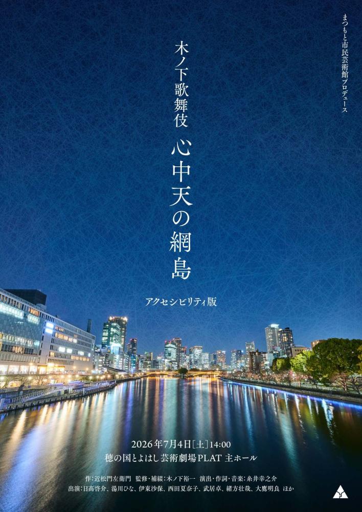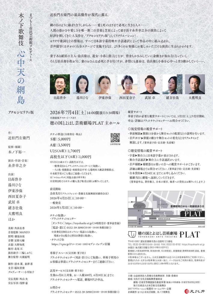 現代演劇、古典芸能ファンから熱い支持を集めるキノカブが再演を重ねている『心中天の網島』をさらに熟成、アクセシビリティをデフォルトで加え上演します。