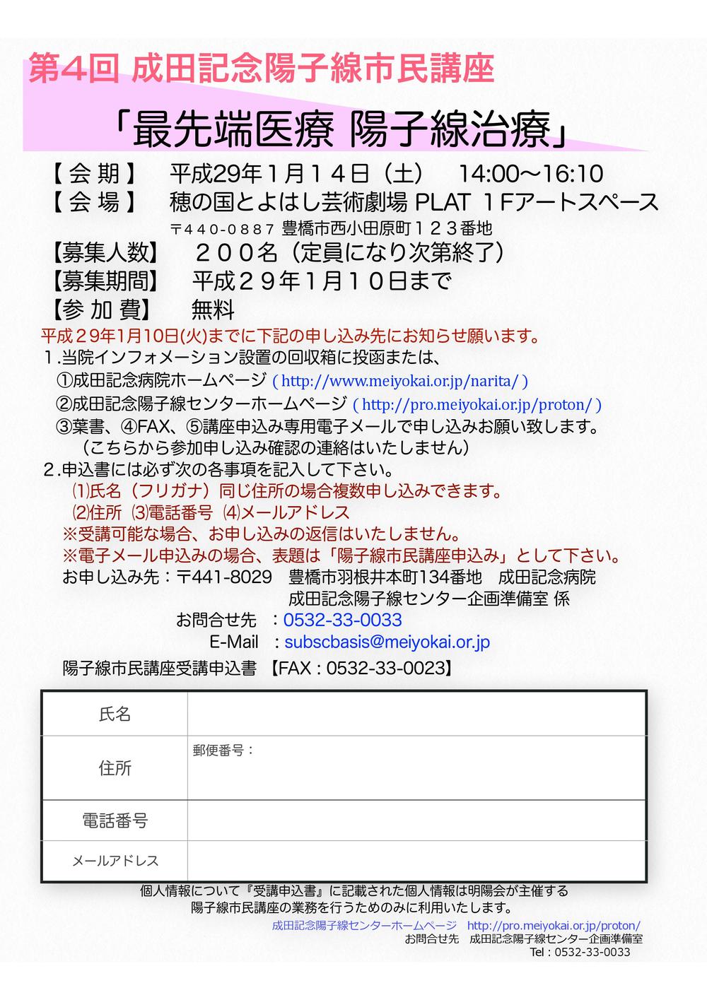 1.成田記念病院インフォメーション設置の回収箱に投函または、 下記方法で申し込み下さい。 ①成田記念病院ホームページ(http://www.meiyokai.or.jp/narita/) ②成田記念陽子線センターホームページ(http://pro.meiyokai.or.jp/proton/) ③葉書 ④FAX ⑤講座申込み専用電子メール 2.申込書には必ず次の各事項を記入して下さい (1)氏名(フリガナ) (2)住所 (3)電話番号 (4)メールアドレス ※同じ住所の場合複数申込できます。 ※受講可能な場合、お申込みの返信はいたしません。 ※電子メール申込みの場合、標題は「陽子線市民講座申込み」として下さい。 |