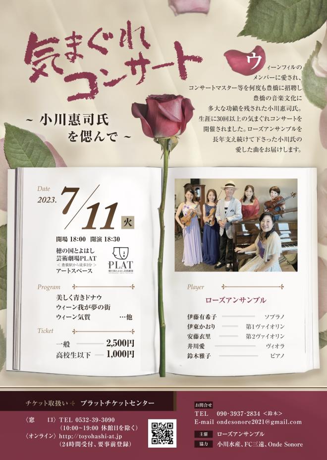 生涯に30回以上の気まぐれコンサートを開催されました。ローズアンサンブルを長年支え続けて下さった小川氏の愛した曲をお届けします。