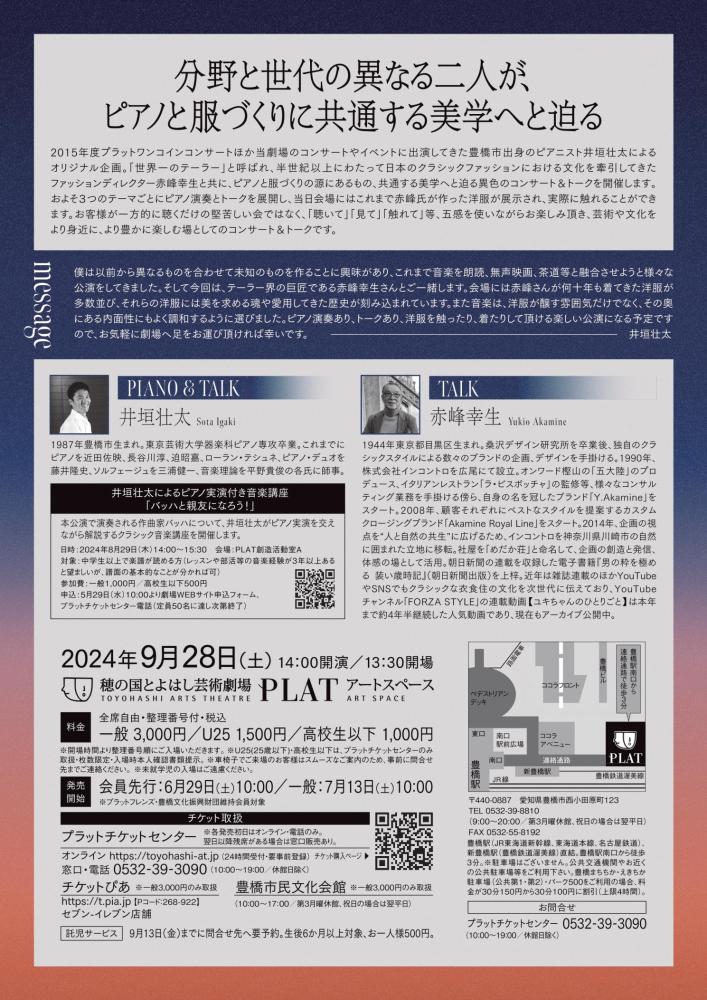 「世界一のテーラー」と呼ばれ、半世紀以上にわたって日本のクラシックファッションにおける文化を牽引してきたファッションディレクター赤峰幸生と共に、ピアノと服づくりの源にあるもの、共通する美学へと迫る異色のコンサート&トークを開催します。