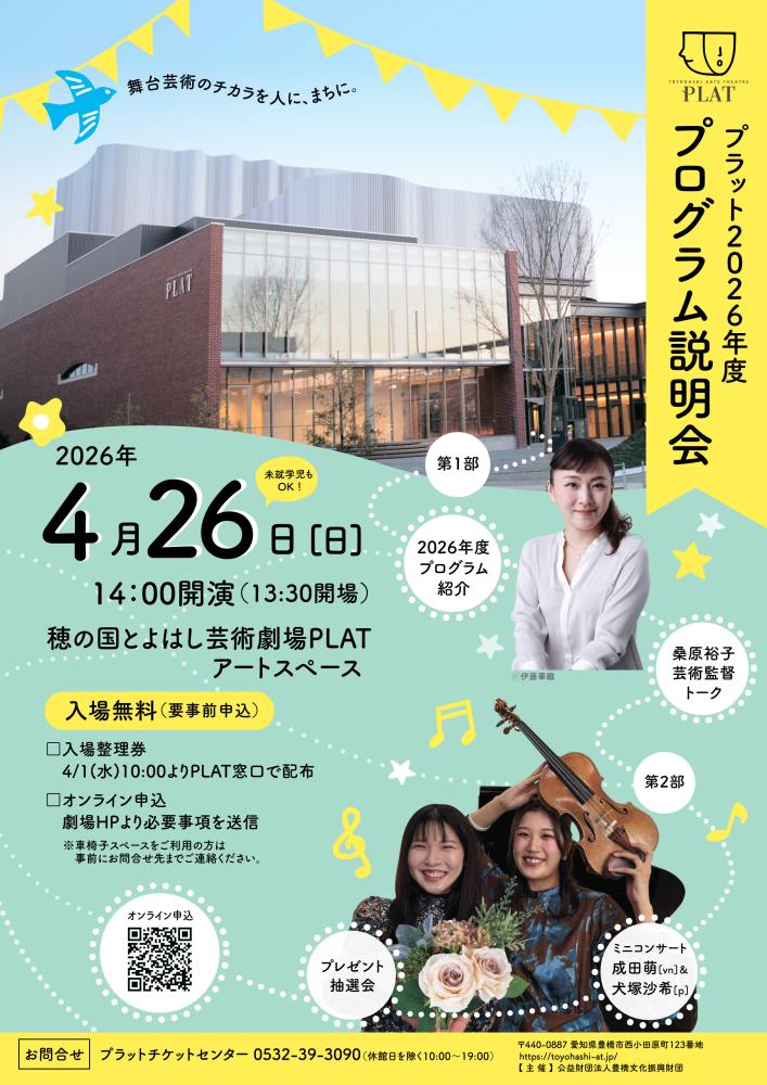2026年04月01日(水) 10:00~ □オンライン:下記の専用申込フォームより必要事項を記入の上、お申込みください。 【プラット2026年度プログラム説明会 申込フォーム】 □整理券:穂の国とよはし芸術劇場PLAT 1階窓口にて配布 |