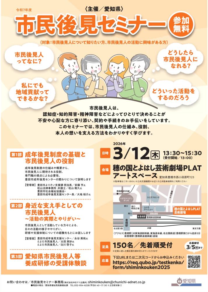 市民後見セミナーでは、市民後見人の仕組みや役割、そして本人の想いを大切にしながら支援する方法について、わかりやすく学びます。