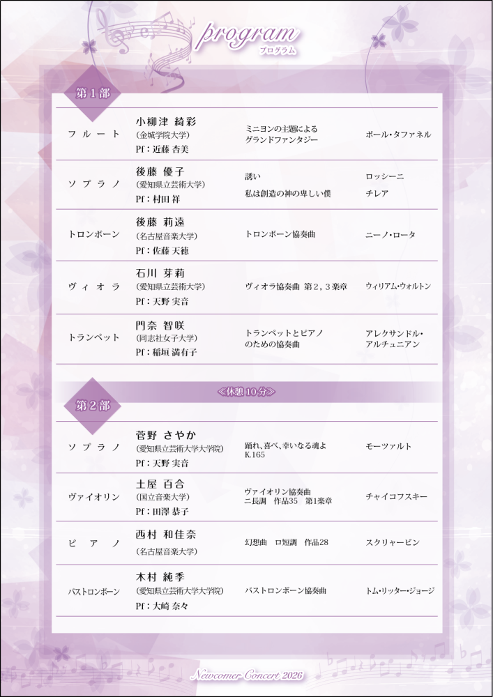 ピアノ、声楽、ヴァイオリン、ヴィオラ、トランペット、バストロンボーン、サキソフォンなどの管楽器による演奏を予定。