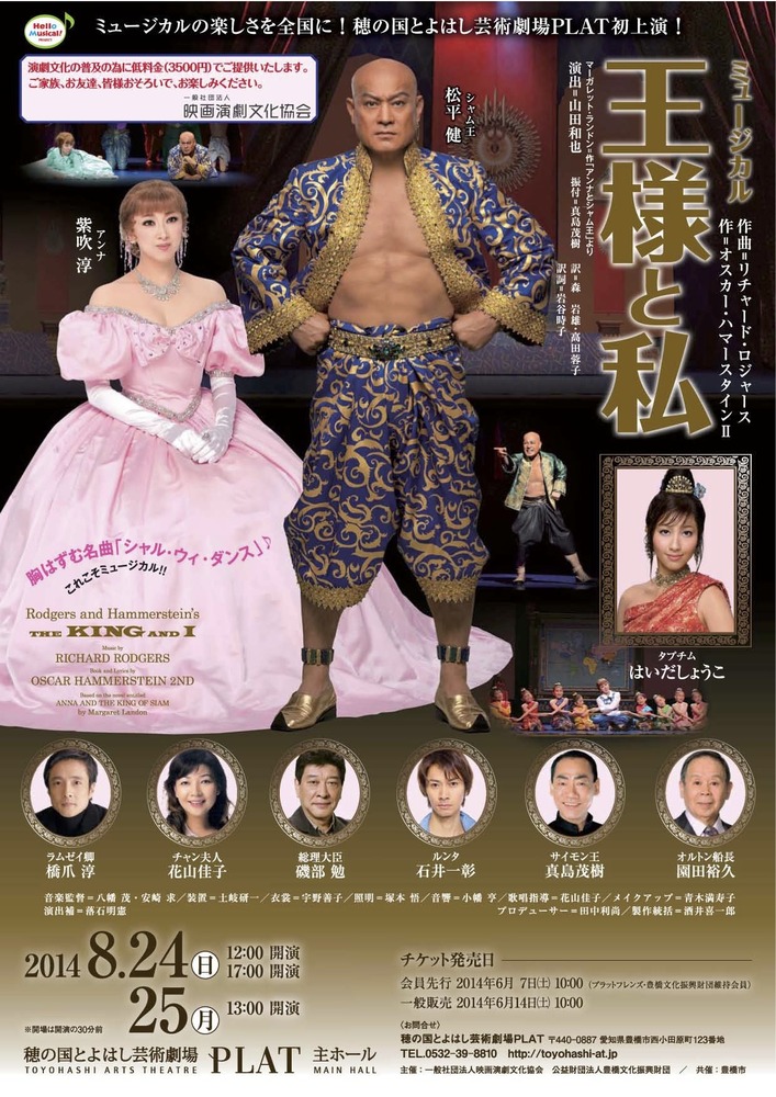 「王様と私」は数々の名曲、ダイナミックなダンスで彩られたブロードウェイ・ミュージカルの傑作です。ミュージカルを初めてご覧になられる方にもお勧めいたします。夏のすばらしい思い出に、みなさまおそろいでお越しください。