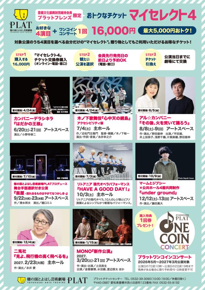 ■6月20日(土)〜21日(日) カンパニーデラシネラ『はだかの王様』(おとな4,500円) ■7月4日(土) 木ノ下歌舞伎『心中天の網島』アクセシビリティ版(S席5,000円) ■8月8日(土)〜9日(日) アル☆カンパニー『その後、火を焚いて踊ろう』(一般4,500円) ■9月22日(火・休)〜23日(水・祝) 穂の国とよはし芸術劇場PLATプロデュース 舞台手話通訳付き公演『楽屋 -流れ去るものはやがてなつかしき- 』(一般4,500円) ■10月3日(土) リトアニア 現代オペラパフォーマンス『HAVE A GOOD DAY!』(一般6,000円) ■12月12日(土)〜13日(日) マームとジプシー×公共ホール4館共同制作『under ground』(一般4,500円) ■2027年2月23日(火・祝) 二兎社『見よ、飛行機の高く飛べるを』(A席5,000円) ■2027年3月20日(土)〜21日(日) MONO『新作公演』(一般4,500円) ※公演には定員がございます。「マイセレクト4」チケット交換券をお持ちでも前売終了の場合ご覧いただけない可能性がございますので、お早めに公演日のご予約をお願いします。 【購入特典】 プラットワンコインコンサート1回券(全席自由・整理番号付き)をプレゼント 対象:2026年5月~2027年3月に開催される「プラットワンコインコンサート」公演 予約:公演日の7日前10:00から公演日の2日前19:00まで、残券がある場合に限り、電話(0532-39-3090)もしくは窓口にて承ります。 ※予約完了後の変更不可 |